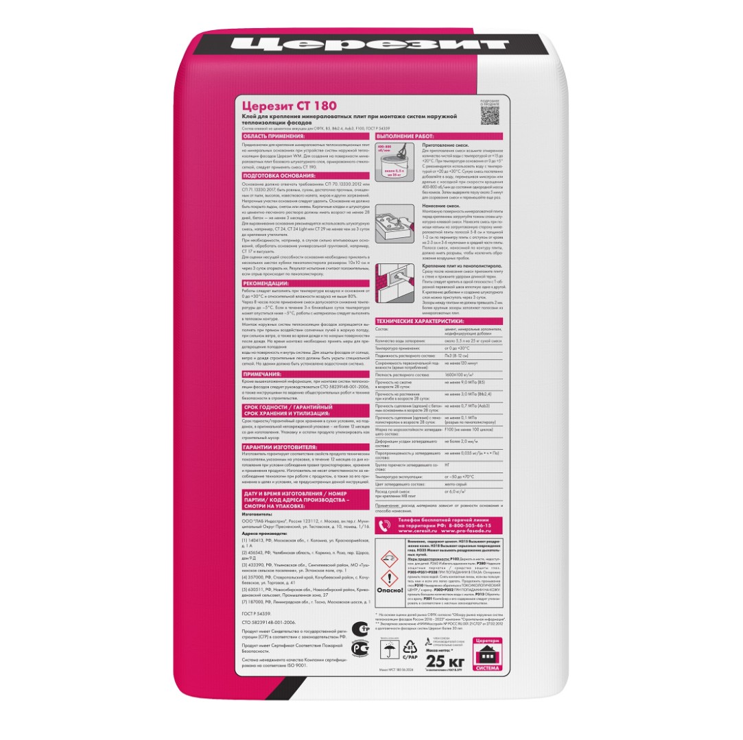 Клеящий состав марки CT 180 разработан для монтажа теплоизоляционных плит из минеральной ваты на основания минерального происхождения. Незаменим при устройстве наружной фасадной теплоизоляции в системе Ceresit WM.