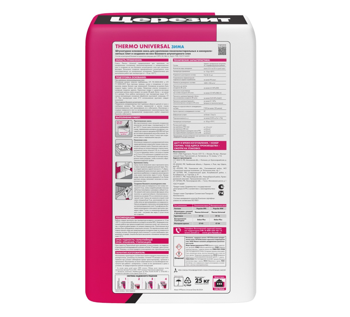 Описание товара: "Клей Ceresit Thermo Universal для пенополистирольных и минераловатных плит Зима (25 кг)"