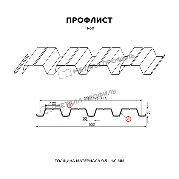 Профлист МЕТАЛЛ ПРОФИЛЬ Н-60x845-A (PURMAN-20-RR32-0,5) часто используется для обустройства профилированного листа. Представляет собой лист оцинкованной стали с покрытием. Толщина стальной основы с оцинковкой и декоративно-защитным слоем — 0.5 мм. После проката на специальном оборудовании сталь приобретает рисунок из повторяющихся волн. Такая конфигурация придает профилю жёсткость.